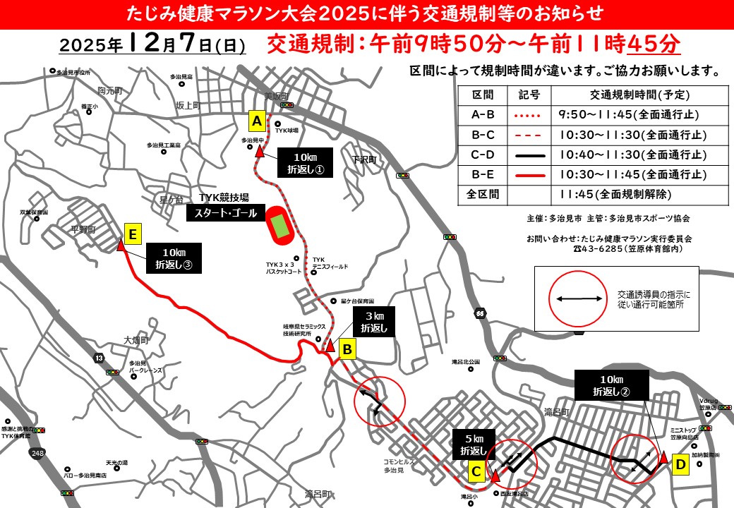 「たじみ健康マラソン2025」の開催に伴い、大会当日は周辺道路の交通規制をおこないます。ご不便をおかけしますが、ご協力をお願いします。