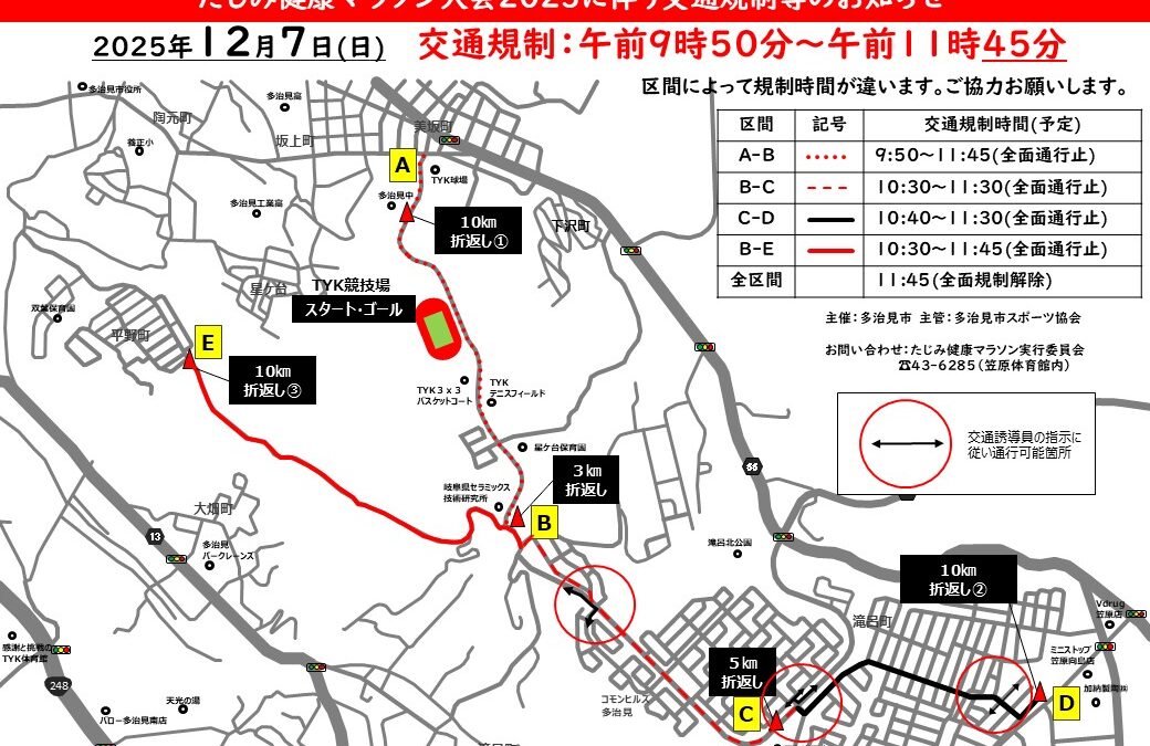 「たじみ健康マラソン2025」の開催に伴い、大会当日は周辺道路の交通規制をおこないます。ご不便をおかけしますが、ご協力をお願いします。