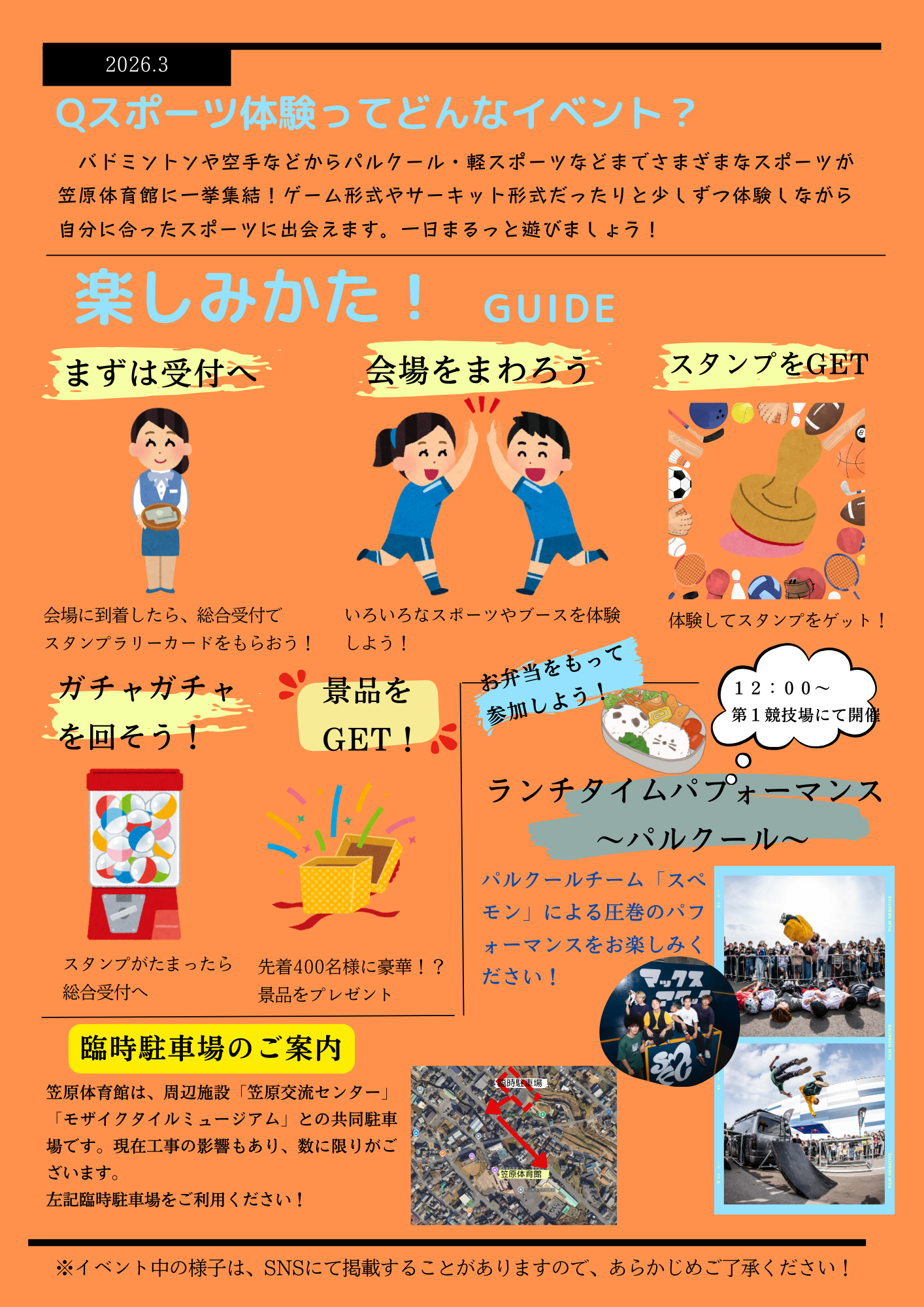| 内容 | パルクール、バスケットボール、バドミントン、ソフトテニス、体操、空手、剣道、その他軽スポーツ ※ 開催種目は変更になる場合があります |